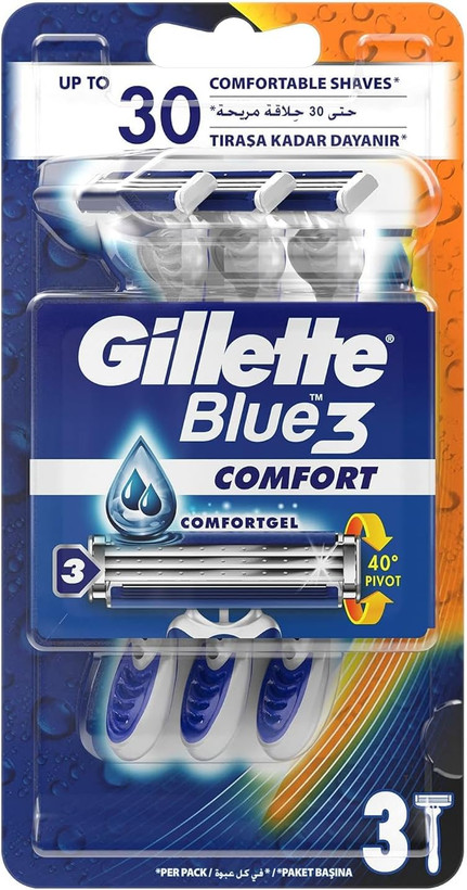 خودتراش 3 تیغه ژیلت Gillette مدل بلوتری کامفورت، دارای نوار 3 لایه صابون مانند برای راحتی هر چه بیشتر در اصلاح میباشد. نوار صابونی خنک کننده برای سر خوردن و راحتی در اصلاح استفاده شده است که باعث نرمی و مرطوب شدن پوست شده و از خارش ، خشکی و خراشیدگی پس از اصلاح جلوگیری و با حساسیت های پوستی مقابله میکند.سر متحرک و قابل انعطاف خود تراش ژیلت باعث تهسیل در حرکت آن روی صورت میشود.