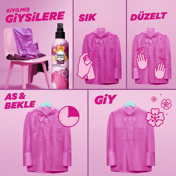 ویژگی: خوشبو کننده لباسها بدون نیاز به شستشو ، ماندگاری بالای رایحه ، کاهش چروک لباسها ، عدم نیاز به اتوکشی لباسها ، جلوگیری از آسیب به بافت لباس در اثر شستشوی زیاد ، مدت زمان اثرگذاری 15 دقیقه