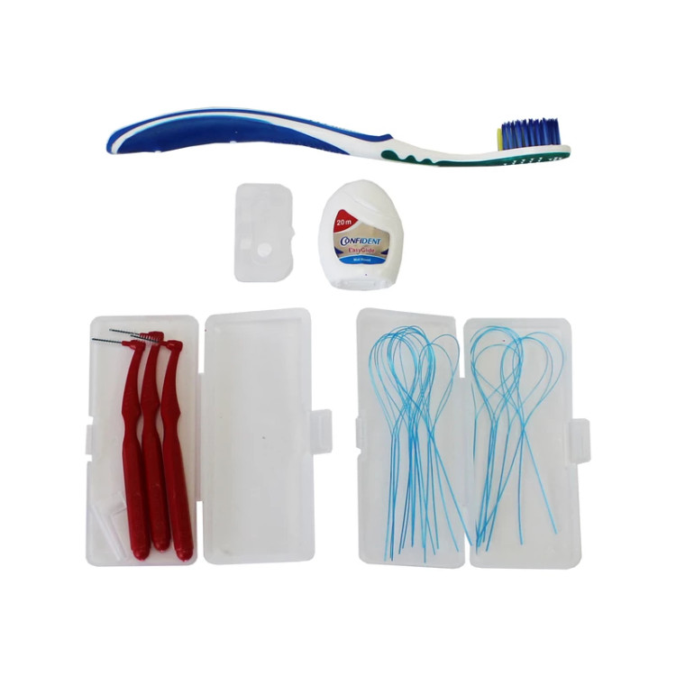اقلام همراه: نخ دندان ، مسواک ، 3عدد مسواک بین دندانی ، قلاب نخ دندان ، درپوش مسواک