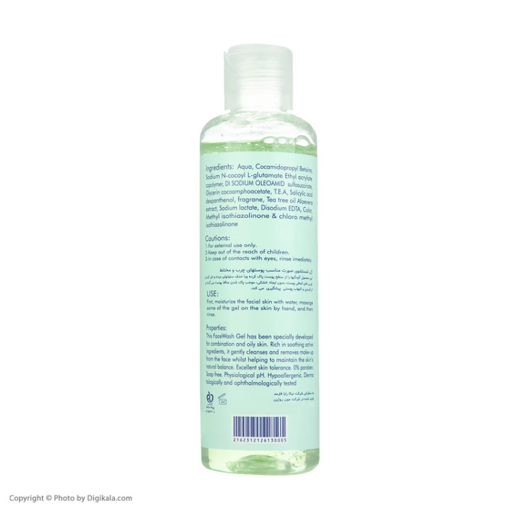 ویژگی: دارای قدرت پاک کنندگی مناسب ، آبرسان و مرطوب کننده پوست ، ضد جوش و آکنه ، ضد التهاب و ضد خارش ،آنتی باکتریال و ضد عفونی کننده ، کنترل کننده ترشح چربی در پوست ، تسکین دهنده و التیام بخش